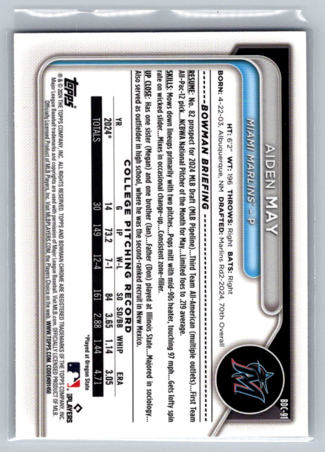 You are purchasing a 2024 Bowman Chrome Aiden May #BDC-91 Speckle Refractor 12/200 1st Bowman Miami Marlins. You will receive the exact item in the photographs. Thank you for looking.