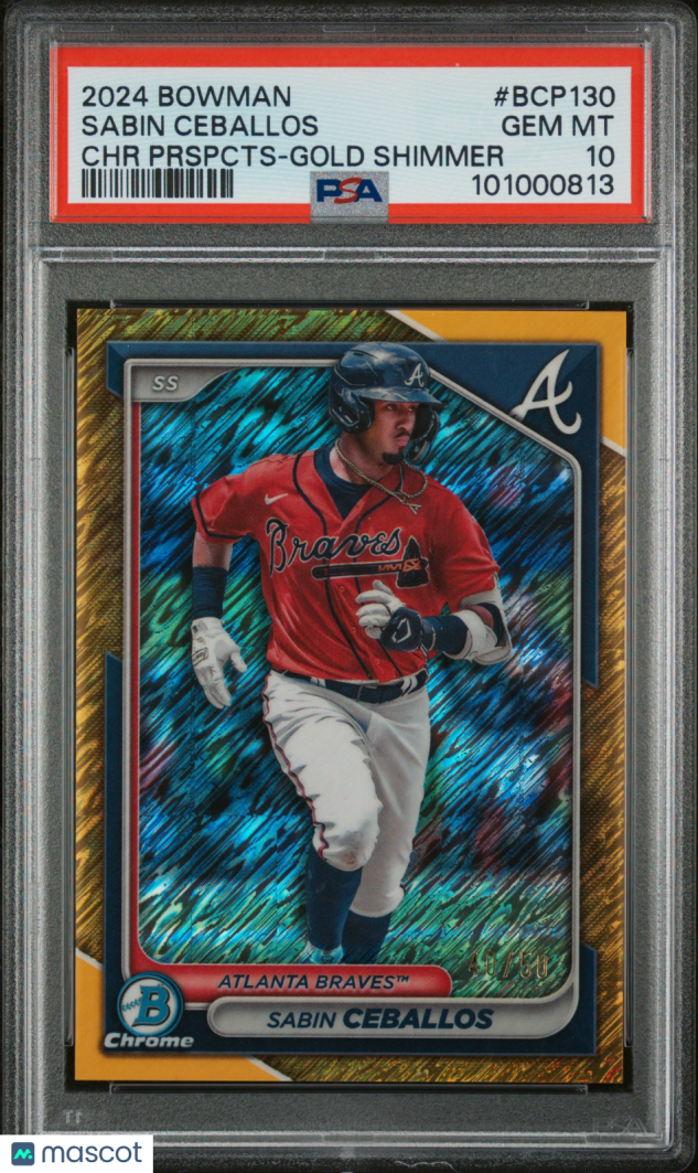 You are purchasing a 2024 Bowman Chrome Sabin Ceballos #BCP130 Gold Shimmer /50 PSA 10. Thank you for looking.