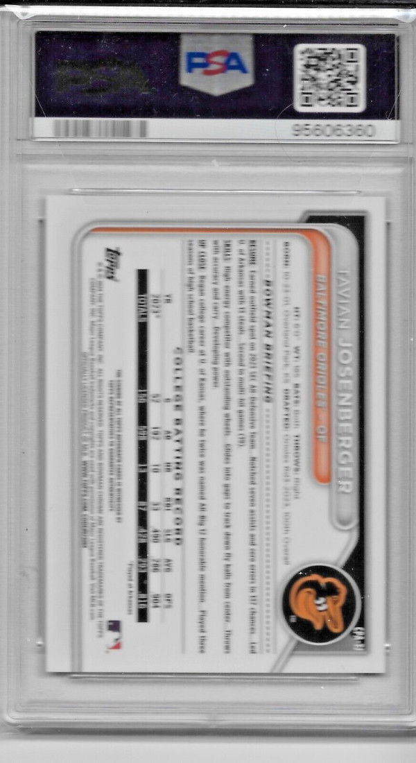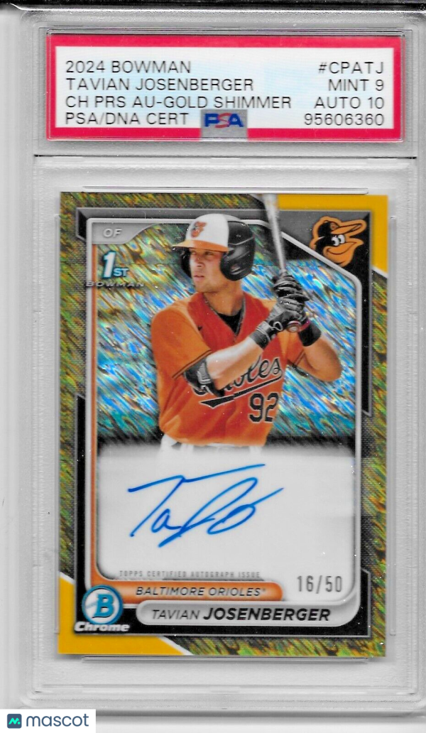 Up for sale is a 2024 Bowman Chrome Prospect Auto Gold Shimmer of Tavian Josenberger. Card is serial # 16/50 and graded a PSA 9 with 10 auto