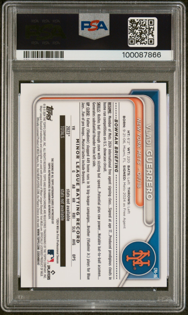 You are purchasing a 2024 Bowman Chrome Prospect Autographs Vladi Guerrero #CPAVG Green Lava 10/99 PSA 10. You will receive the exact item in the photographs. Thank you for looking.