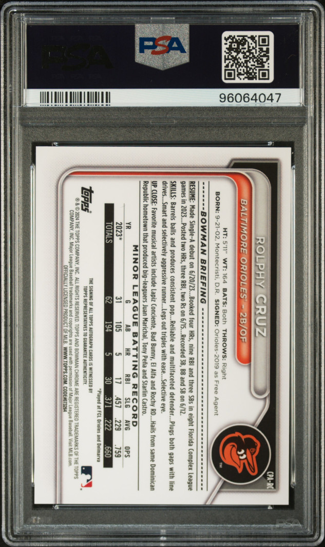 2024 Bowman Chrome Prospect Autographs Rolphy Cruz PSA 9