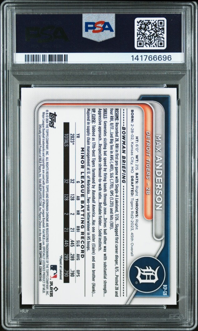 The product is a 2024 Bowman Chrome Blue Refractor Max Anderson PROSPECT trading card numbered #BCP128 graded as PSA 9 MINT. This sports trading card features football player Max Anderson and is part of the 2024 Bowman set. The Blue Refractor parallel adds a unique touch to this limited edition card, with only 150 produced and certified by PSA with certification number 141766696. A collectible item for fans and collectors of sports trading cards.
