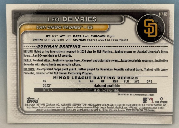 You are purchasing a 2024 Bowman Leo De Vries Gold Parallel/Variety. You will receive the exact item in the photographs. Thank you for looking.