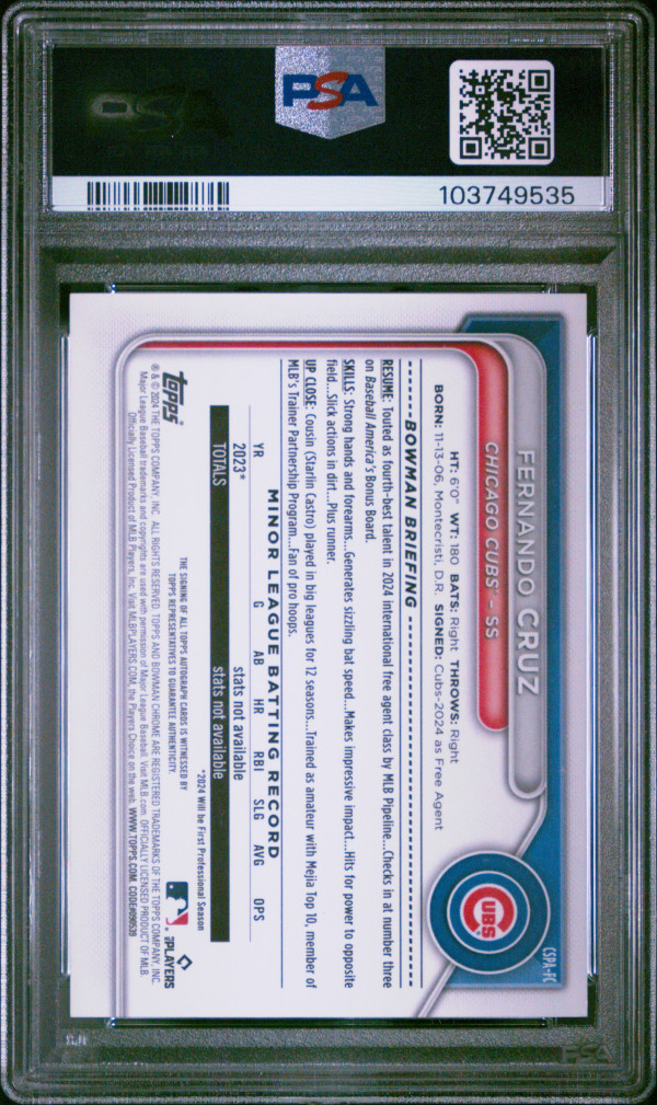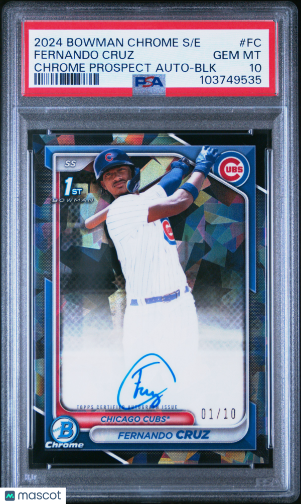 You are purchasing a 2024 Bowman Chrome Sapphire Edition Prospects Autographs Fernando Cruz #FC BLK 01/10 PSA 10. You will receive the exact item in the photographs. Thank you for looking.