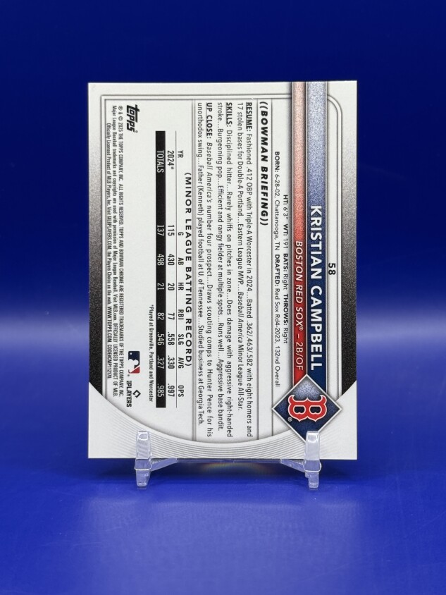 Don’t miss your chance to own this stunning 2024 Bowman Chrome Stained Glass parallel featuring Boston Red Sox prospect Kristian Campbell! This highly sought-after RC (Rookie Card) is a must-have for serious MLB collectors and Red Sox fans alike. The vibrant stained glass design and crisp Topps quality make this card a standout addition to any collection.