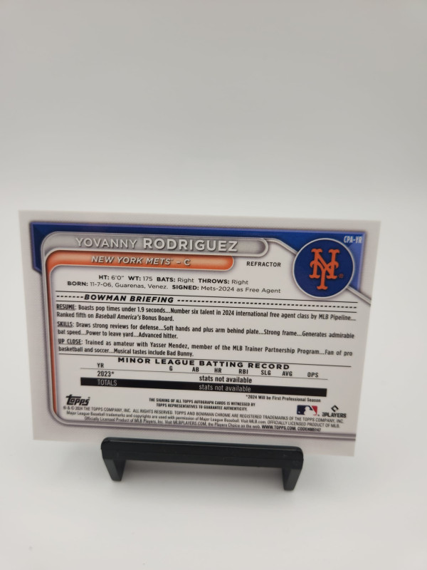 This is his first professional season (2024), and this Bowman Chrome Refractor Auto is the card that collectors will be chasing as his career develops. Don't miss your chance to own this early piece of a future Mets cornerstone.
