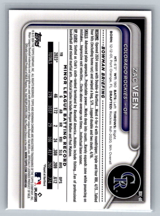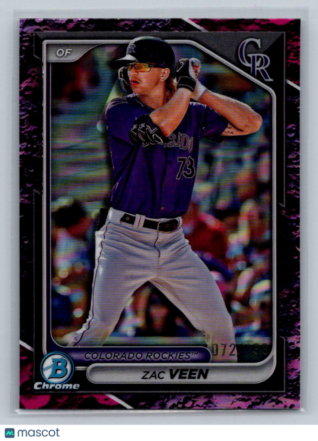 You are purchasing a 2024 Bowman Chrome Zac Veen #BDC-61 Fuchsia Lunar 72/199 Colorado Rockies. You will receive the exact item in the photographs. Thank you for looking.