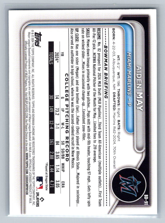 You are purchasing a 2024 Bowman Draft Aiden May #BD-91 Sky Blue 310/499 Miami Marlins. You will receive the exact item in the photographs. Thank you for looking.