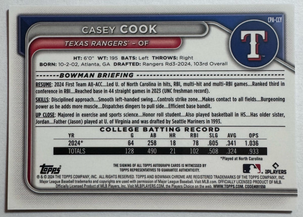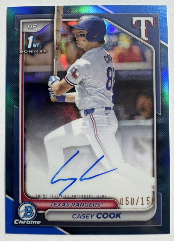 The product is a 2024 Bowman Draft Casey Cook Chrome Auto Blue Refractor trading card, featuring the autograph of Casey Cook from the Texas Rangers. This limited edition card numbered CPA-CCY is part of the Chrome Prospect Autographs Blue Refractor set, making it a valuable addition to any baseball card collection. As a MLB prospect, this autographed card of Casey Cook is sure to be highly sought after by baseball card enthusiasts and fans of the Texas Rangers alike.
