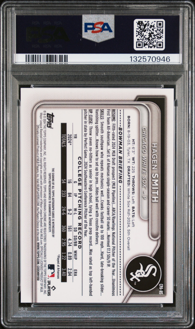 The 2024 Bowman Draft Chrome Prospect Hagen Smith Auto PSA 10 trading card features an autograph from Hagen Smith, a player in Major League Baseball for the Chicago White Sox. Manufactured by Topps, this original card is part of the Chrome Prospect Autographs insert set from the Bowman Draft series. As a rookie card, it holds value for collectors and fans of baseball trading cards. This autographed card is a sought-after item for those looking to add a piece of baseball memorabilia to their collection.