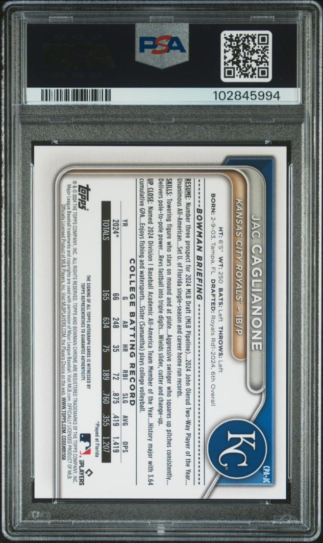 The product is a 2024 Bowman Draft 1st Chrome JAC CAGLIANONE Aqua Lava AUTO /199 baseball trading card, graded as a PSA 10. This rare card features an autograph from MLB player Jac Caglianone of the Kansas City Royals, with a limited print run of only 199 copies.