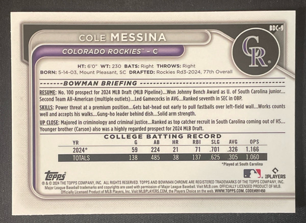 You are purchasing a 2024 bowman draft chrome Cole Messina 1st bowman gold refractor /50. Upon purchase you will receive the exact card pictured. BMWT