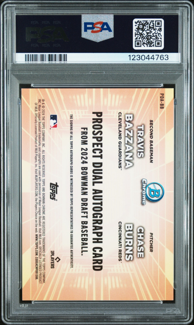 You are purchasing a 2024 Bowman Draft Travis Bazzana Chase Burns #PDABB Prospect Dual Autographs /99 PSA 9. You will receive the exact item in the photographs. Thank you for looking.