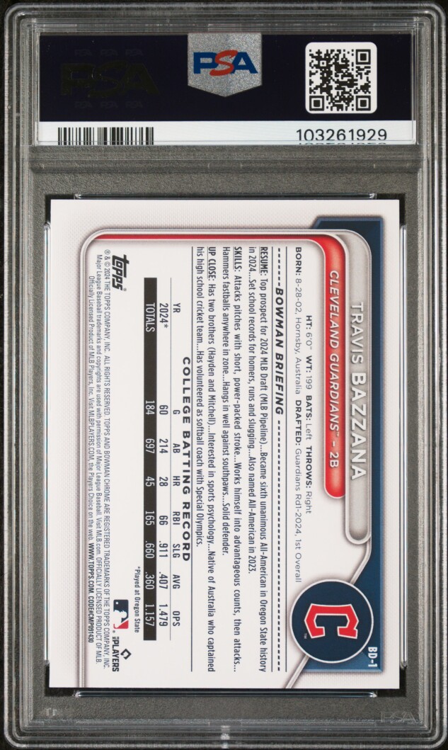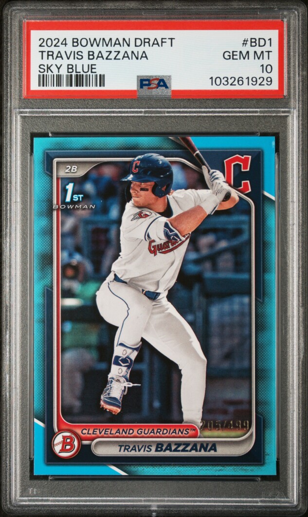 The product is a 2024 Bowman Draft Paper Prospects Travis Bazzana #BD-1 Sky Blue /499 PSA 10 rookie trading card. This baseball card features Travis Bazzana from the Cleveland Guardians, part of the MLB World Series. The card is serial numbered, parallel in variety, and graded a perfect 10 by Professional Sports Authenticator (PSA). Manufactured by Bowman, the card is a valuable addition to any sports trading card collection.