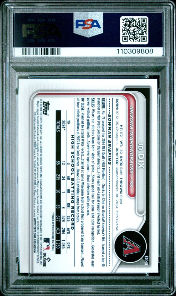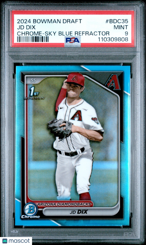 You are purchasing a 2024 Bowman JD DIX #BDC-35 Sky Blue Refractor Short Print 1st Edition Rookie PSA 9. You will receive the exact item in the photographs.