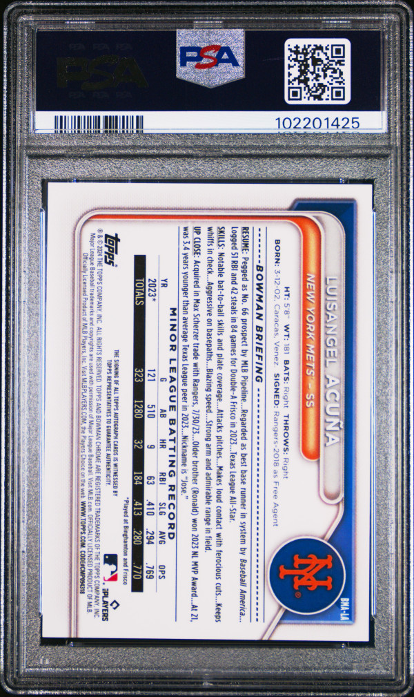 You are purchasing a 2024 Bowman Mega Box Chrome Bowman Prospect Mega Autographs Luisangel Acuna #LA Prospects Purple Ref 124/199 PSA 9. You will receive the exact item in the photographs. Thank you for looking.