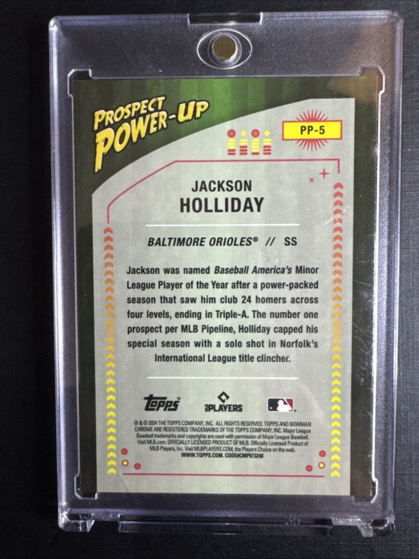 You are purchasing a 2024 Bowman Jackson Holliday #PP-5 Rookie Insert. You will receive the exact card in the photographs. Thank you for looking.