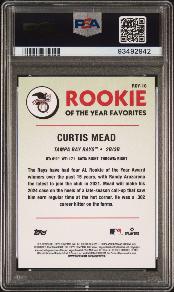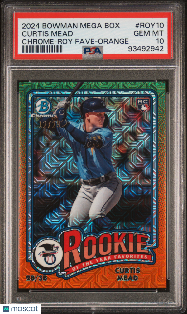You are purchasing a 2024 Bowman Mega Box Chrome Rookie Of The Year Favorites Curtis Mead #ROY10 Insert PSA 10. You will receive the exact item in the photographs. Thank you for looking. 12/25