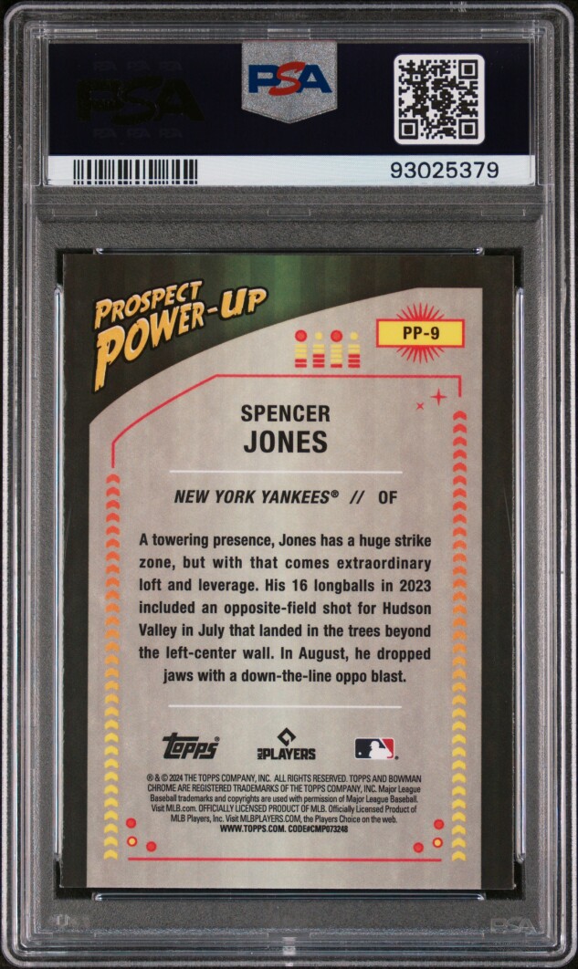 The 2024 Bowman Chrome Spencer Jones Prospect Power-Up #PP9 Yankees PSA 10 trading card by Topps features a PSA 10 Gem Mint rating, making it a highly sought-after collectible for fans of the New York Yankees. This baseball card showcases the prospect power-up insert set, highlighting the up-and-coming talent of Spencer Jones in Major League Baseball. With its unique design and limited availability, this card is sure to be a valuable addition to any sports card collection.