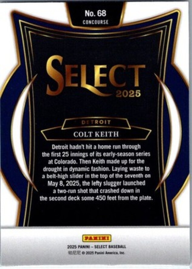 This is a nice example of a 2024 Panini Select #30 Colt Keith