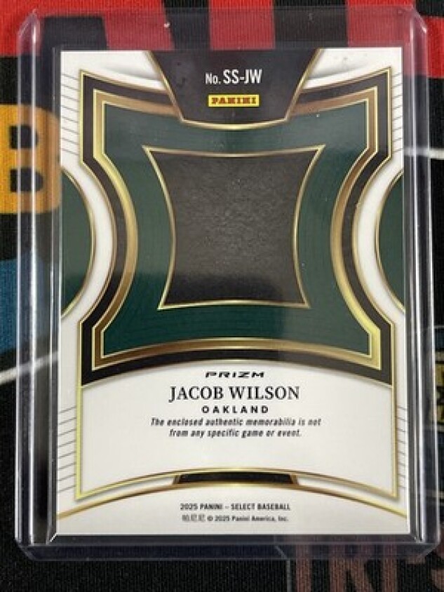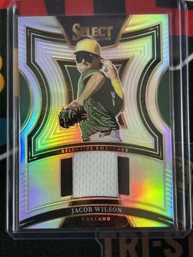 This is a nice example of a 2024 Panini Select #SS-JW Jacob Wilson Selective Swatches Prizm