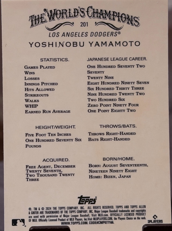 2024 Topps Allen & Ginter Chrome Yoshinobu Yamamoto #201 (RC)