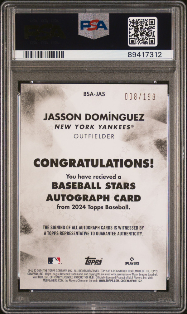 You are purchasing a 2024 Topps Baseball Stars Autographs Jasson Dominguez #BSAJAS Black PSA 10. You will receive the exact item in the photographs. Thank you for looking.