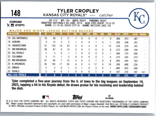 In 2024 Tyler Cropley played for the Kansas City Royals.