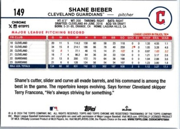 This is a nice example of a 2024 Topps Chrome #149 Shane Bieber
