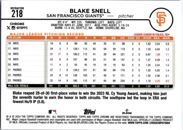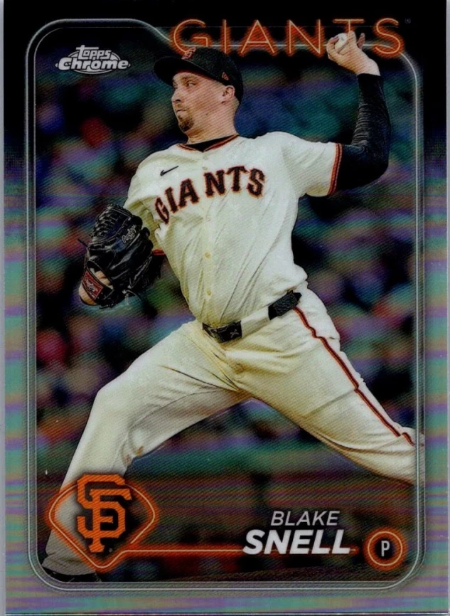 This is a nice example of a 2024 Topps Chrome #218 Blake Snell Refractors