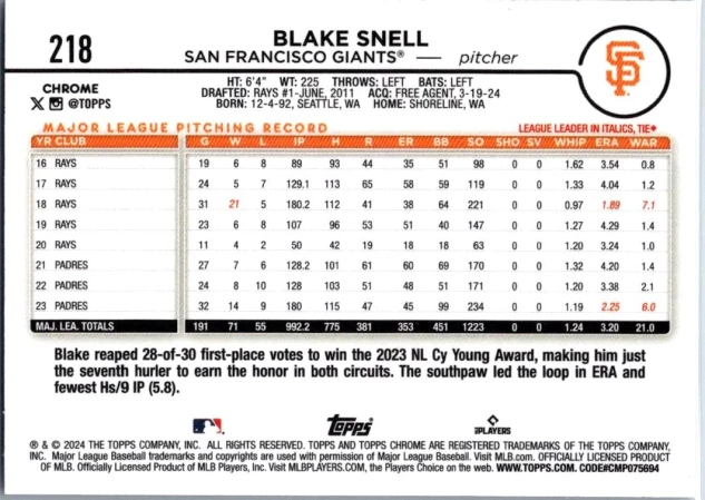2024 Topps Chrome #218 Blake Snell X-Fractors