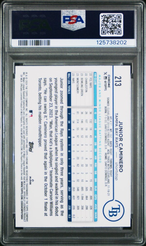 Thanks for your looking at my listing 2024 Topps Chrome Junior Caminero X-fractor PSA 10. Let me know if you have any questions!