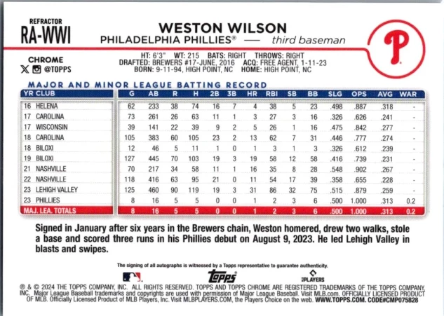 This is a nice example of a 2024 Topps Chrome #RA-WWI Weston Wilson Rookie Autographs Refractor