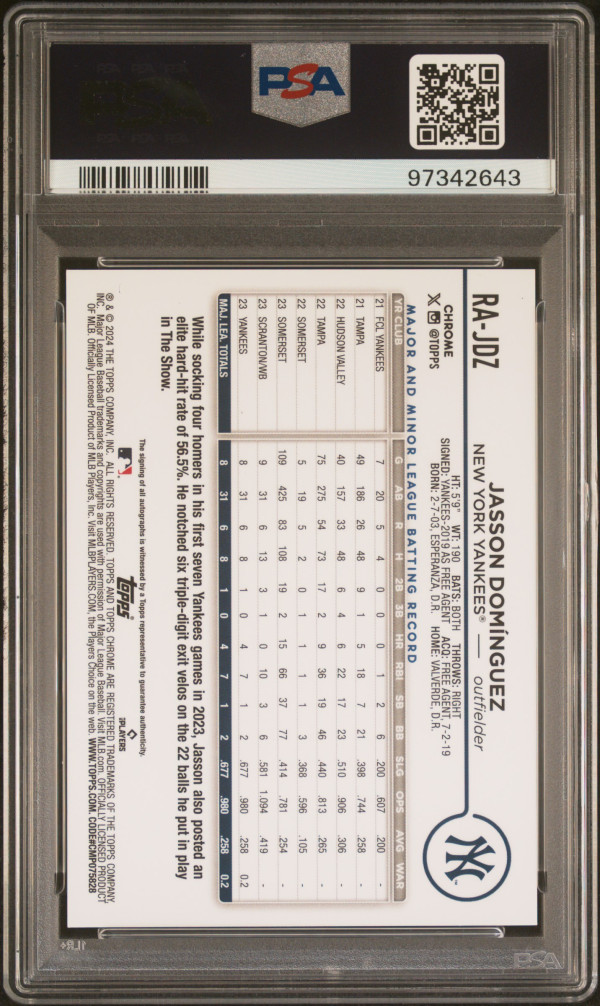You are purchasing a 2024 Topps Chrome Rookie Autographs Jasson Dominguez #RAJDZ Blue Raywave 135/150 PSA 9. You will receive the exact item in the photographs. Thank you for looking.