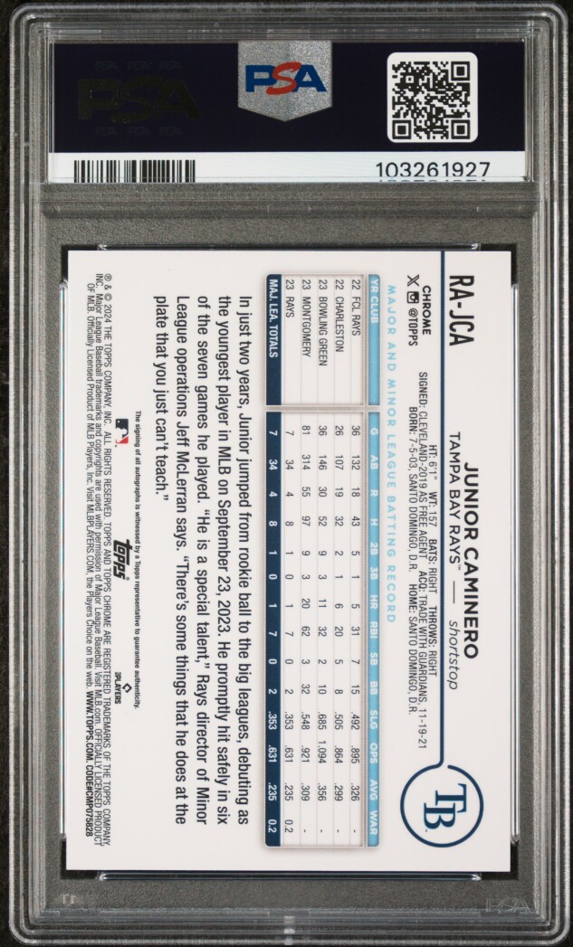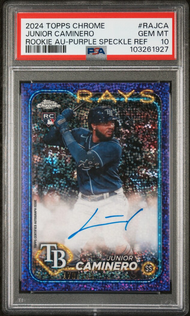 2024 Topps Chrome Rookie Autographs Junior Caminero Rookie Au-Purple Speckle Ref PSA 10