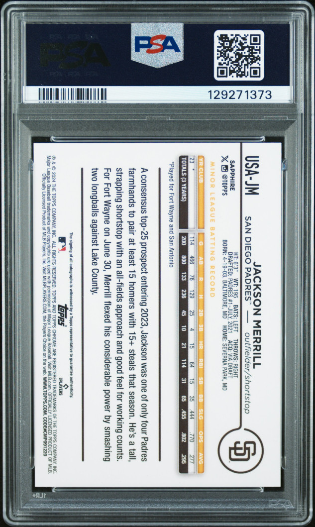 2024 Topps Chrome Sapphire Update Series Chrome Sapphire Autographs Jackson Merrill Autograph-Green PSA 10 AUTO 10