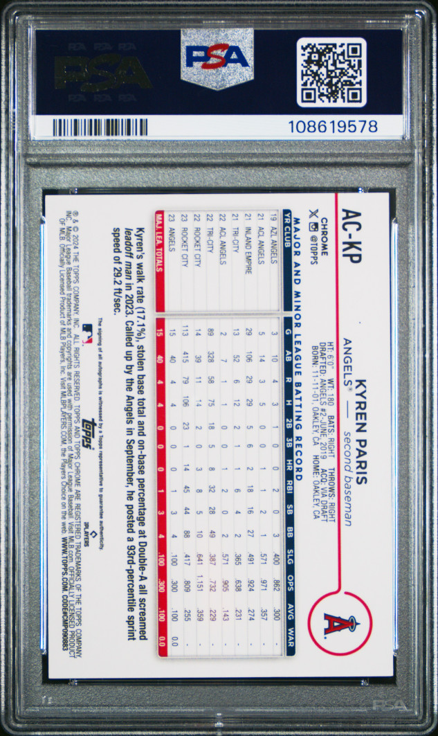 2024 Topps Chrome Update Chrome Baseball Update Series Autographs #ACKP Kyren Paris Autograph-Blue Raywave PSA 10