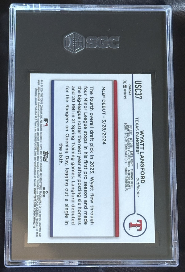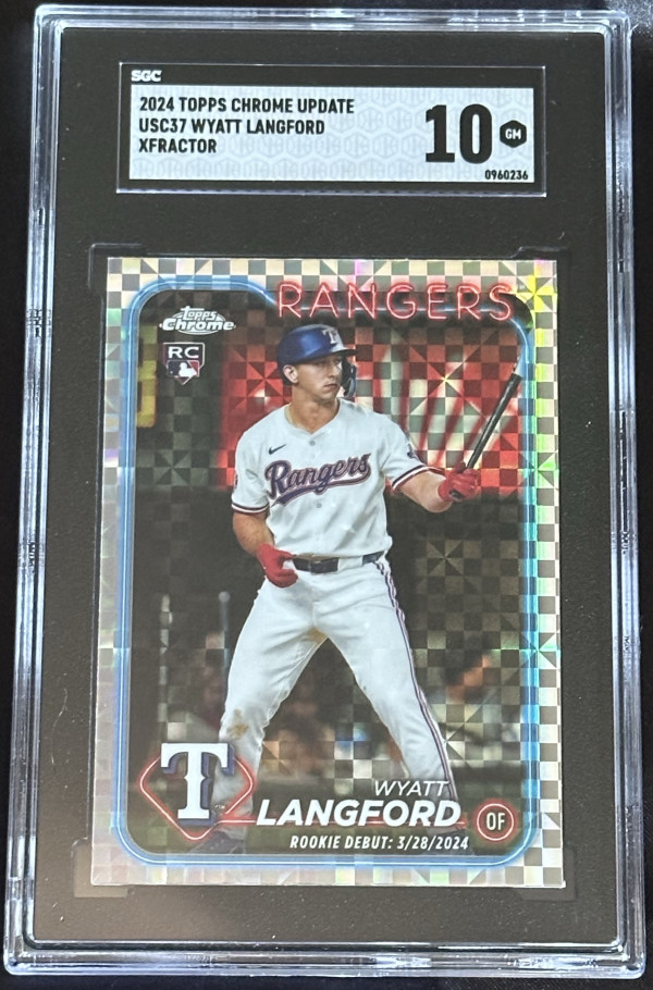 2024 Topps Chrome Xfractor rookie card of Texas Rangers Outfielder Wyatt Langford, card #USC37. Graded Gem Mint 10 by SGC
