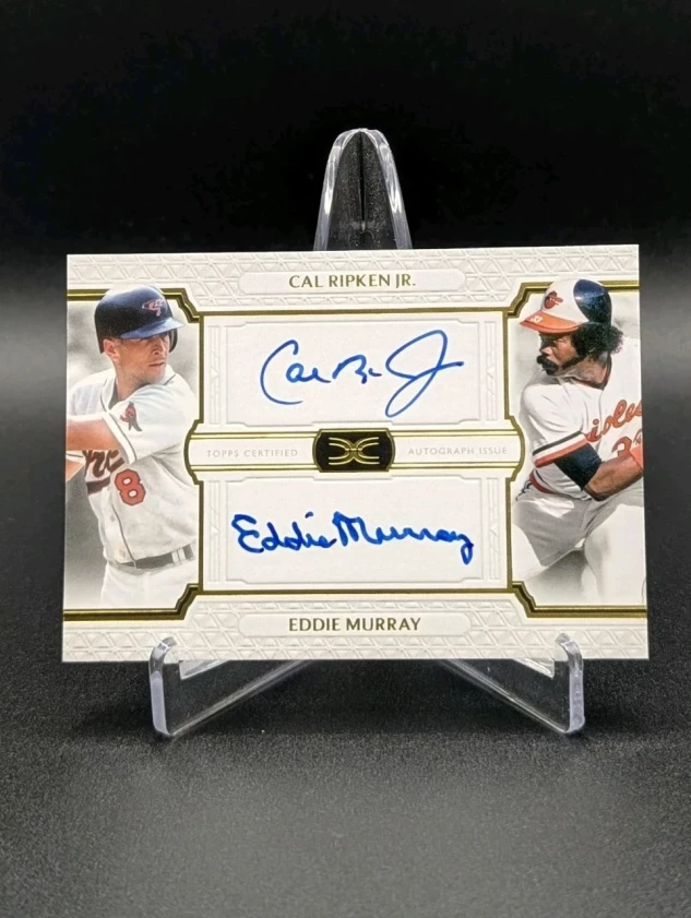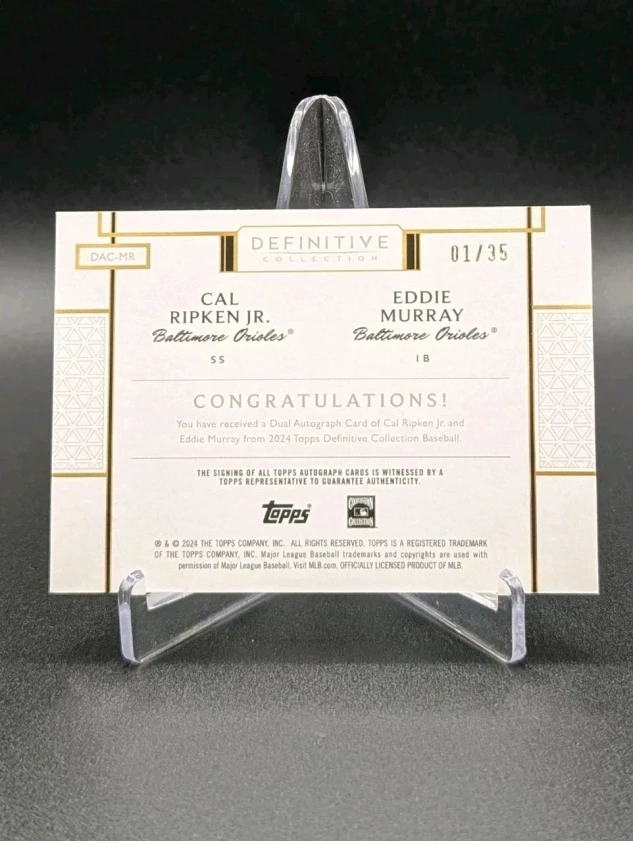 The 2024 Topps Definitive Cal Ripken Jr / Eddie Murray - Dual Auto 1/35 - Bookend trading card is a highly collectible item for baseball fans and card enthusiasts. This limited edition card features the signatures of both Cal Ripken Jr. and Eddie Murray, making it a valuable addition to any sports memorabilia collection. With only 35 copies in existence, this hard-signed autographed card is a rare find for fans of the Baltimore Orioles and Major League Baseball. The card is part of the 2024 Topps set and is made of high-quality card stock, making it a prized possession for collectors.