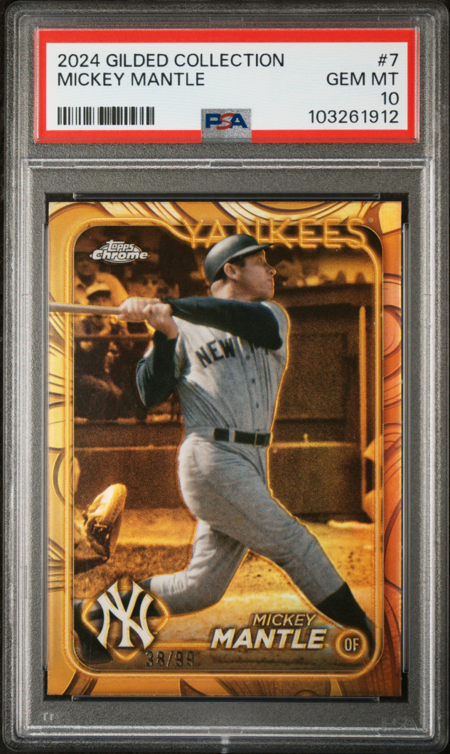 The product is a 2024 Topps Gilded Collection Gold trading card featuring Mickey Mantle, with a print run of only 99. This particular card is graded PSA 10 and is #'d 39/99 SSP, with a population of only 10 in existence. It is a standard-sized card made of card stock, part of the Major League Baseball set for the 2024 season. The card does not feature an autograph but is serial numbered and comes from the original Topps manufacturer. This rare and highly collectible item is a valuable addition to any baseball card collection, especially for fans of the New York Yankees and the MLB World Series.