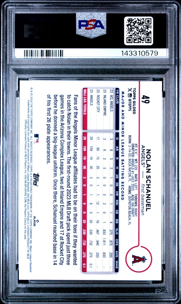The 2024 Topps Gilded Collection Nolan Schanuel #49 Gold Lava Refractor /10 is a highly coveted sports trading card for baseball fans and collectors. This limited edition card features the rookie player from the Los Angeles Angels, graded a 9 by Professional Sports Authenticator (PSA). With only 10 copies in existence, this rare card is a valuable addition to any baseball card collection. The Gold Lava Refractor adds a unique and eye-catching element to this special card, making it a standout piece for fans of Nolan Schanuel and the sport of baseball.