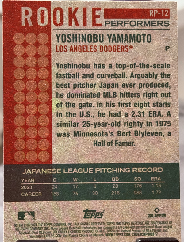 2024 Topps Heritage High Number Rookie Performers Yoshinobu Yamamoto #RP12 RC SP