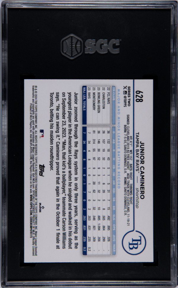 You are purchasing a 2024 Topps Junior Caminero #628 SGC 10. You will receive the exact item in the photographs. Thank you for looking.