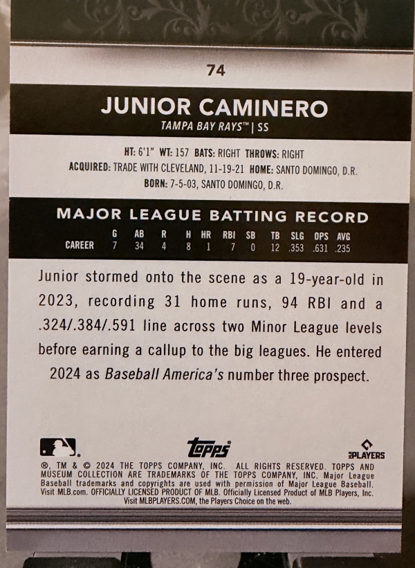 2024 Topps Museum Collection - Junior Caminero #74 (RC)