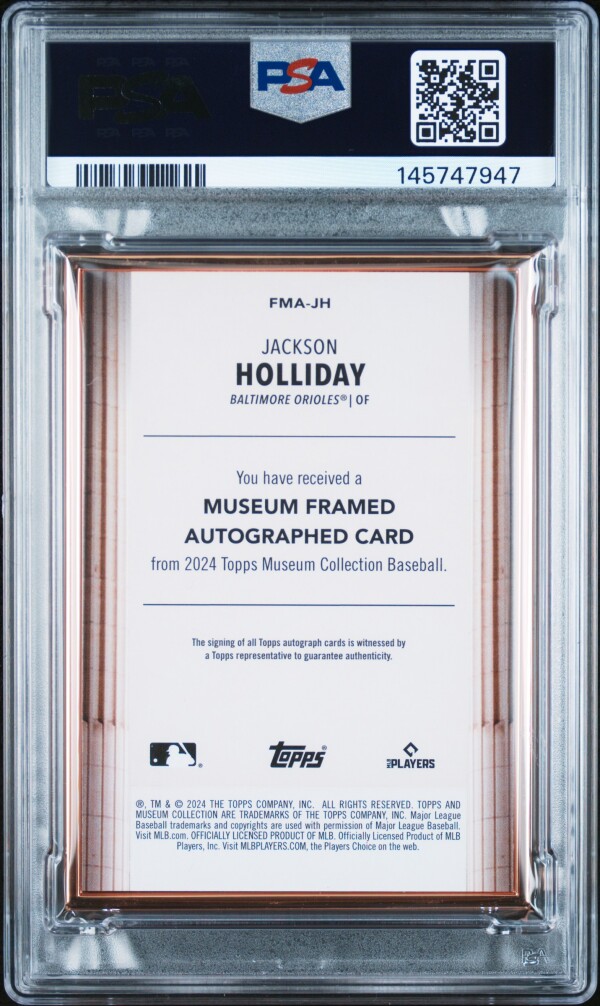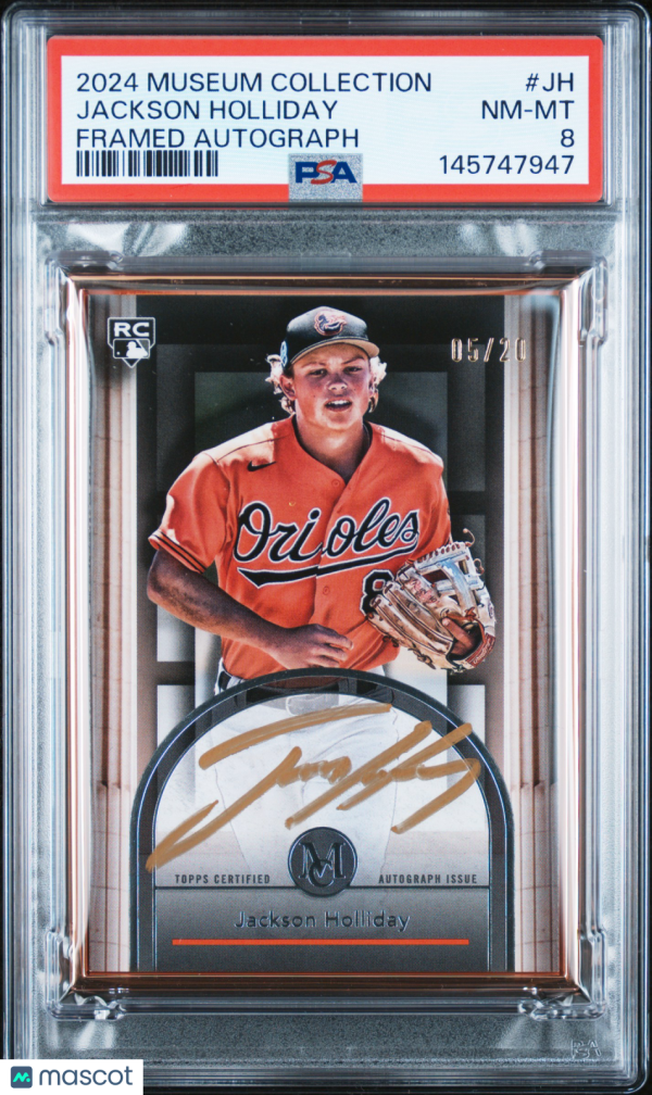 You are purchasing a 2024 Topps Museum Collection Museum Framed Autographs Jackson Holliday #JH 05/20 PSA 8. You will receive the exact item in the photographs. Thank you for looking.
