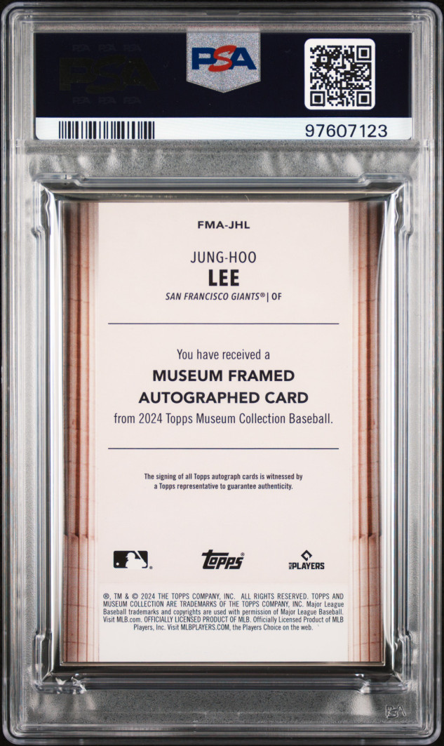 The product is a 2024 Topps Museum Collection rookie card of Jung-Hoo Lee, autographed by the player himself. This limited edition card is numbered to only 15 copies, each featuring a framed autograph and graded as a PSA 9. Manufactured by Topps in the United States, this baseball card showcases Lee in his San Francisco Giants uniform from the 2024 MLB World Series. A sought-after collectible for fans and collectors of modern sports trading cards.