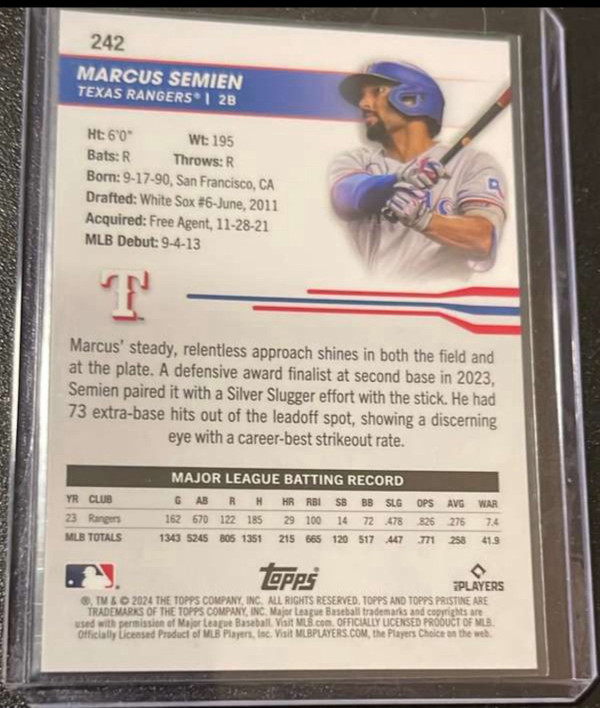 2024 Topps Pristine - Purple Refractor #242 Marcus Semien, Texas Rangers /99