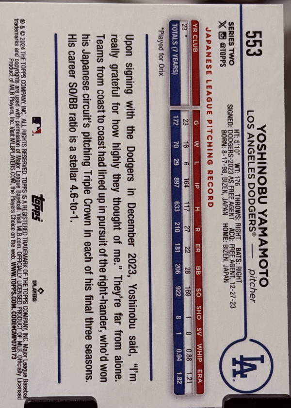 2024 Topps Series 2 - Yoshinobu Yamamoto #553 (RC)