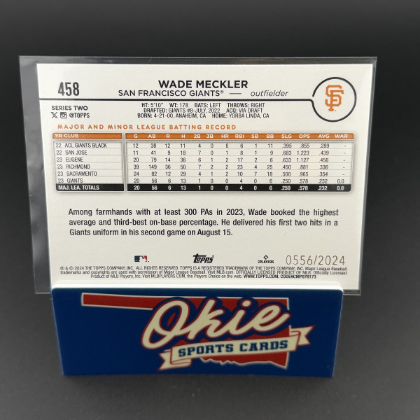 You are purchasing a 2024 Topps Series Two Wade Meckler #458 Gold /2024 RC. You will receive the exact item in the photographs. Thank you for looking.