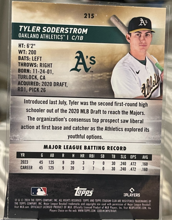 2024 Topps Stadium Club - Tyler Soderstrom #215 Chrome (RC) Variety Oakland As